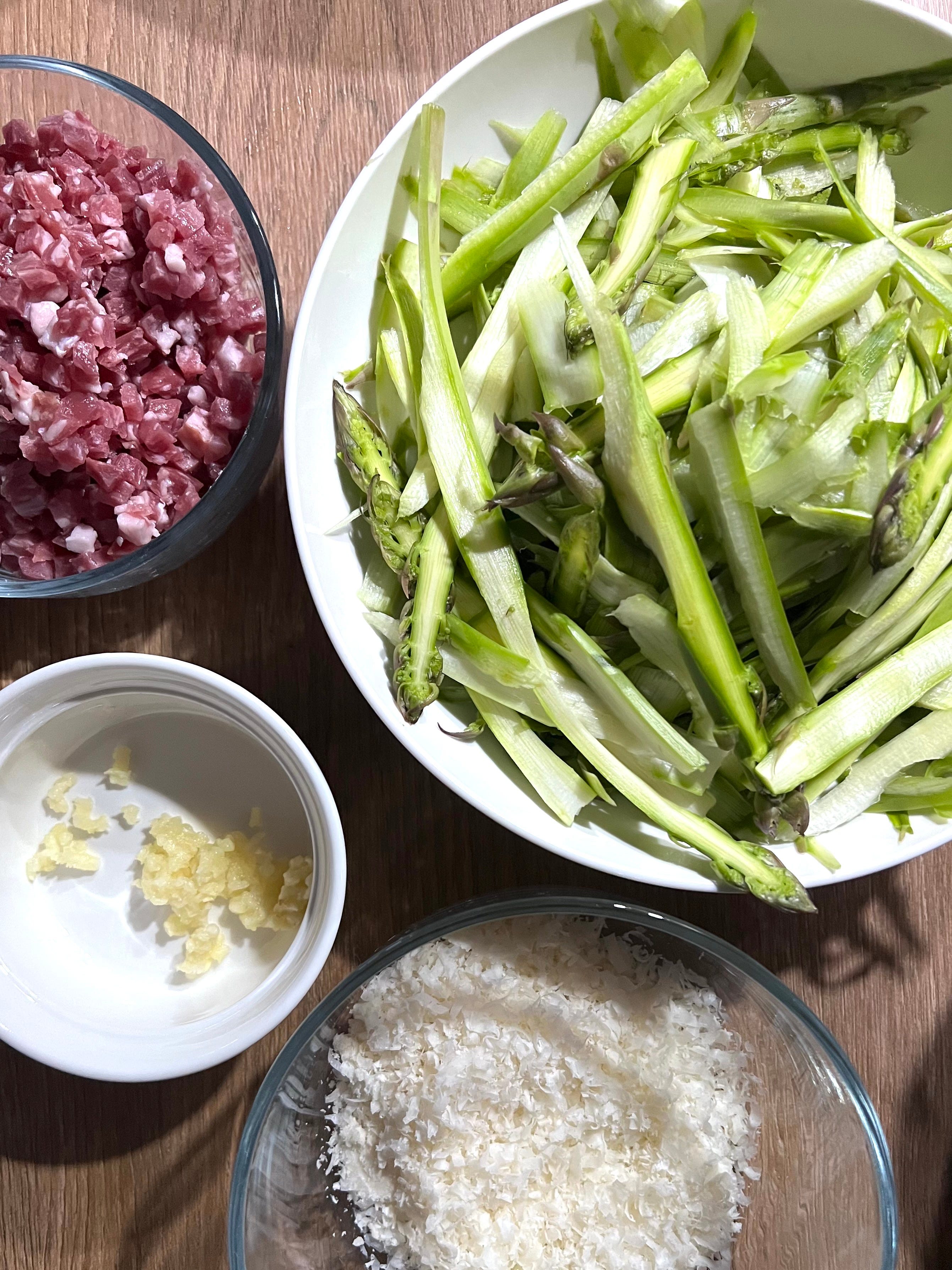 Build the base flavor While the pasta cooks, melt the butter in a large pan over medium-low heat. Add the diced pancetta, garlic, and asparagus ribbons. Cook gently, stirring frequently, allowing everything to soften and the asparagus to absorb the flavor of the butter, pancetta, and garlic.